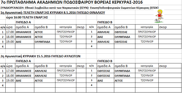 Στις 8 Μαϊου ορίστηκε η σέντρα στο φετινό, 7ο Πρωτάθλημα Ακαδημιών Ποδοσφαίρου Βόρειας Κέρκυρας (συνδιοργάνωση ΕΣΥΝ κι ΕΠΣΚ).