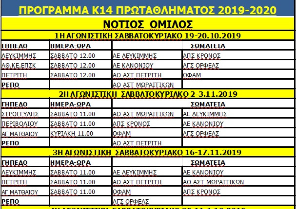 Δείτε όλο το πρόγραμμα του πρωταθλήματος Κ14 (νότιος όμιλος) της ΕΠΣ Κέρκυρας.