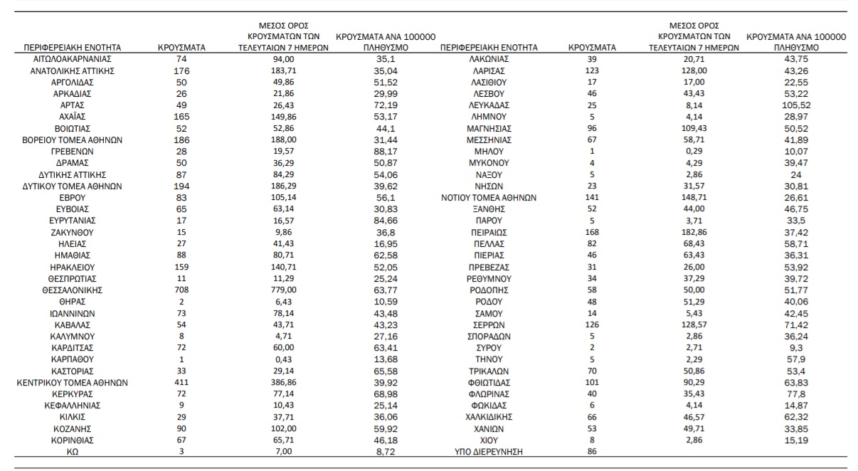 Αναλυτικά, η διασπορά των νέων κρουσμάτων ανά περιφερειακή ενότητα: