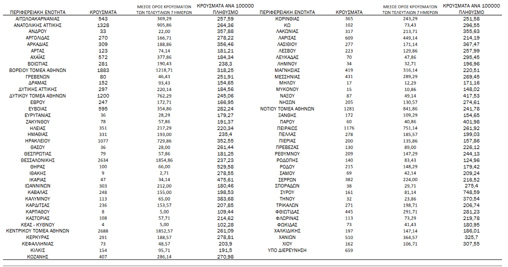 Αναλυτικά, η διασπορά των νέων κρουσμάτων ανά περιφερειακή ενότητα:
