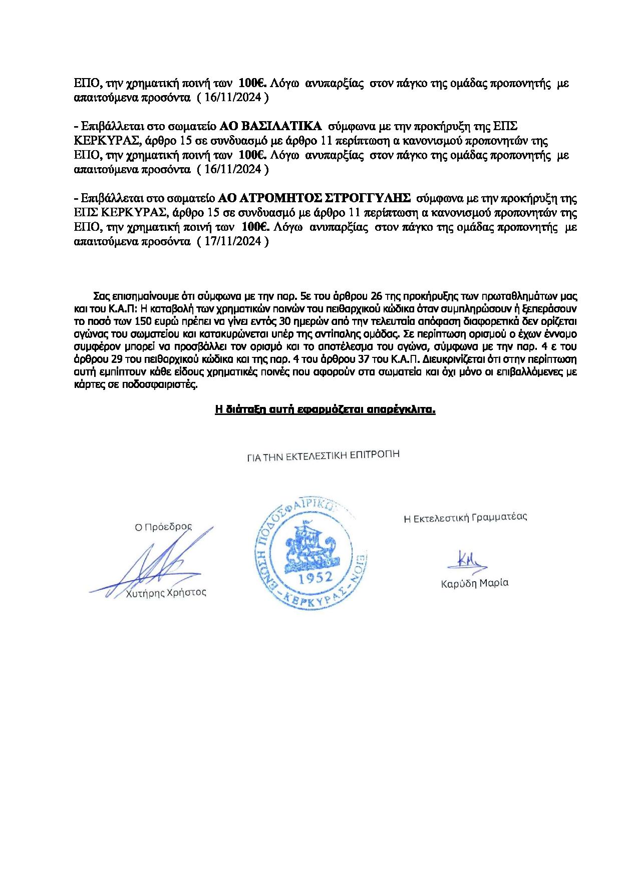 Η ΕΠΣΚ ανακοίνωσε το νέο ποινολόγιο της Πειθαρχικής Επιτροπής. <img class="alignnone wp-image-55186 size-full" src="https://www.corfusports.com/wp-content/uploads/2024/11/4948-page-001.jpg" alt="" width="1240" height="1754" /> <img class="alignnone wp-image-55187 size-full" src="https://www.corfusports.com/wp-content/uploads/2024/11/4948-page-002.jpg" alt="" width="1240" height="1754" />