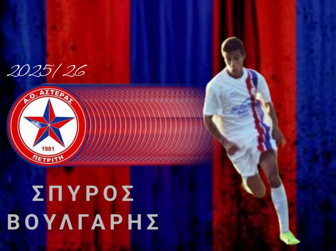Ο Αστέρας ανακοινώνει την απόκτηση του ποδοσφαιριστη Σπύρου Βούλγαρη. Ο Σπύρος κατά το παρελθόν έχει αγωνιστεί για δύο σεζον στον Αστερα σε ηλικια 15 ετων. Ακολούθησαν οι ομάδες του ΑΟ Κέρκυρας U20 και στην συνέχεια αγωνίστηκε με στην ΑΕ Λευκίμμης και Αναγέννηση Περιβολίου, όπου αποκτήθηκε, σημειώνοντας και με τις δυο ομάδες μεγάλες επιτυχίες. Καλωσοριζουμε τον Σπύρο ξανά στον Αστερα και του ευχόμαστε υγεια και επιτυχιες.
