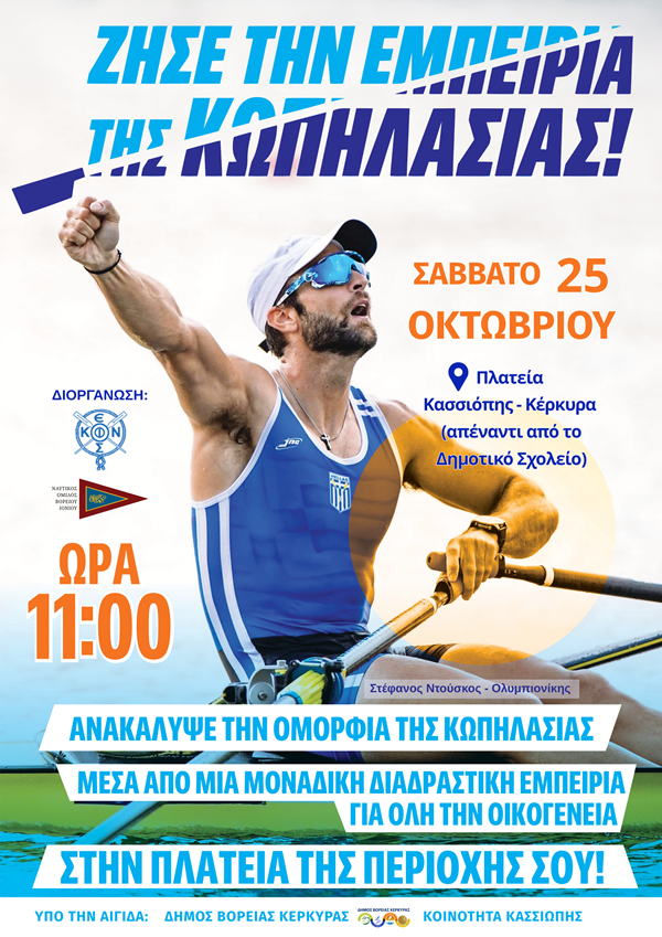 Η δράση θα πραγματοποιηθεί στην ΠΛΑΤΕΙΑ ΚΑΣΣΙΟΠΗΣ –απέναντι από το Δημοτικό Σχολείο- και έχει ως στόχο να φέρει το άθλημα της Κωπηλασίας πιο κοντά στο κοινό, να το γνωρίσουν μικροί και μεγάλοι και να εμπνευστούν από τις αξίες της ομαδικότητας, της πειθαρχίας και της προσπάθειας.