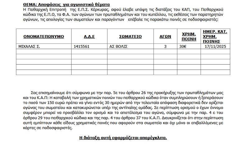 Διαβάστε το ποινολόγιο της Πειθαρχικής Επιτροπής της ΕΠΣΚ. <img class="alignnone wp-image-59890 size-full" src="https://www.corfusports.com/wp-content/uploads/2025/10/cats-12.jpg" alt="" width="765" height="467" />