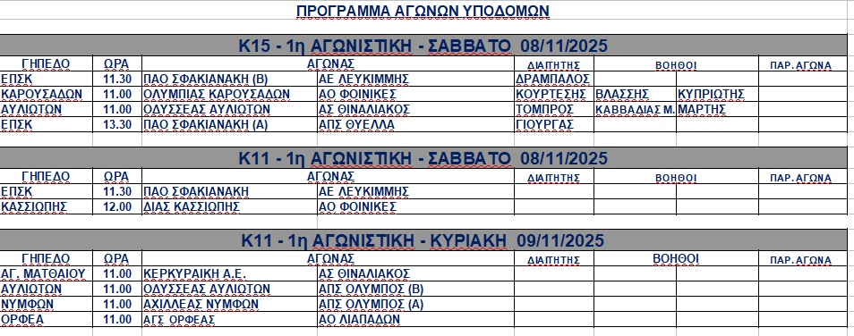 Η ΕΠΣ Κέρκυρας ανακοίνωσε το πρόγραμμα στα πρωταθλήματα των υποδομών για αυτό το Σαββατοκύριακο. <img class="alignnone wp-image-60180 size-full" src="https://www.corfusports.com/wp-content/uploads/2025/11/cats-1.jpg" alt="" width="954" height="376" />