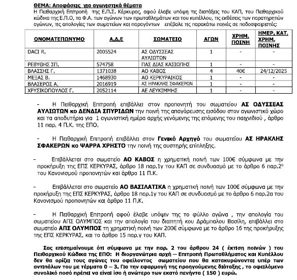 Δείτε τι αποφάσισε η Πειθαρχική Επιτροπή της ΕΠΣ Κέρκυρας.