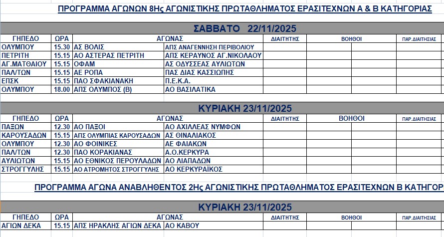 Δείτε συνοπτικά, το πρόγραμμα των αγώνων του Σ/Κ στα τοπικά πρωταθλήματα. <img class="alignnone wp-image-60468 size-full" src="https://www.corfusports.com/wp-content/uploads/2025/11/5183-1.jpg" alt="" width="890" height="475" />