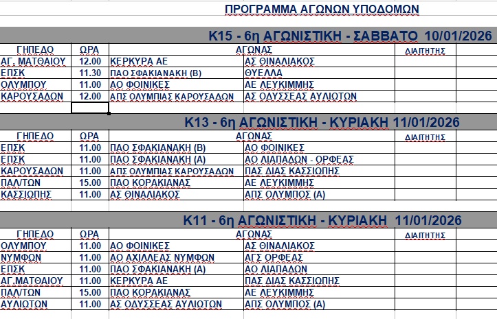 Η ΕΠΣΚ ανακοίνωσε το πρόγραμμα της πρώτης αγωνιστικής για το 2026 στα πρωταθλήματα υποδομών. <img class="alignnone wp-image-61024 size-full" src="https://www.corfusports.com/wp-content/uploads/2026/01/cats.jpg" alt="" width="723" height="465" />