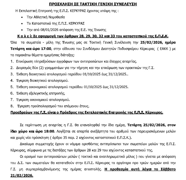 Στις 25/2, η Τακτική ΓΣ της ΕΠΣΚ!
