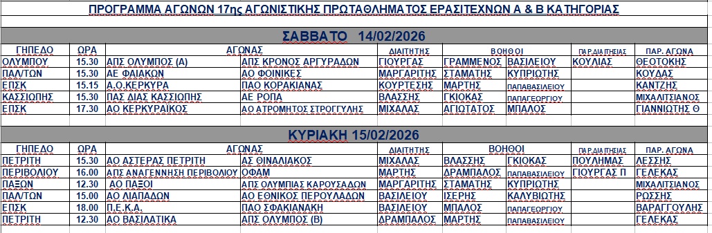 Η Ένωση ανακοίνωσε τους διαιτητές των αγώνων του Σ/Κ 14-15 Φεβρουαρίου.