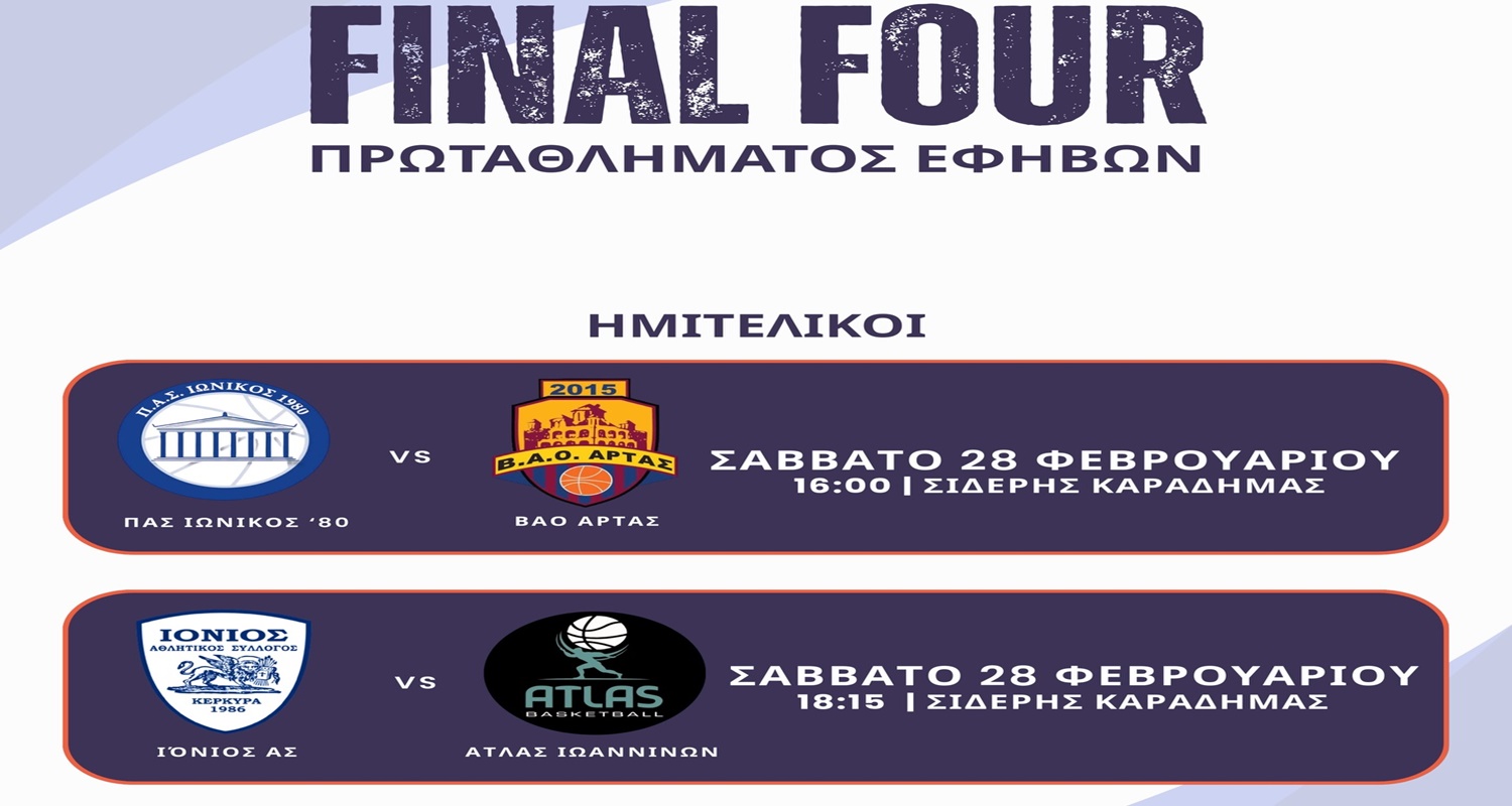 Σε ρυθμούς Final4 βρίσκονται στην ομάδα Εφήβων του Ιονίου. Καθώς, η κερκυραϊκή ομάδα θα συμμετάσχει το Σ/Κ στην τελική φάση της διοργάνωσης. Με τον Ιόνιο να αγωνίζεται στο δεύτερο ημιτελικό απέναντι στον Άτλαντα Ιωαννίνων. Το ματς, βεβαίως, θα είναι, επί της ουσίας, εκτός έδρας μιας και το F4 θα διεξαχθεί στα Γιάννενα.