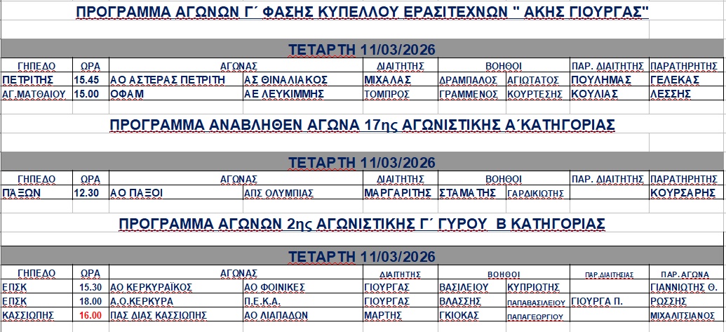 Αρκετά παιχνίδια θα διεξαχθούν την Τετάρτη που αφορούν το Κύπελλο Κέρκυρας, την Α αλλά και τη Β ΕΠΣΚ.