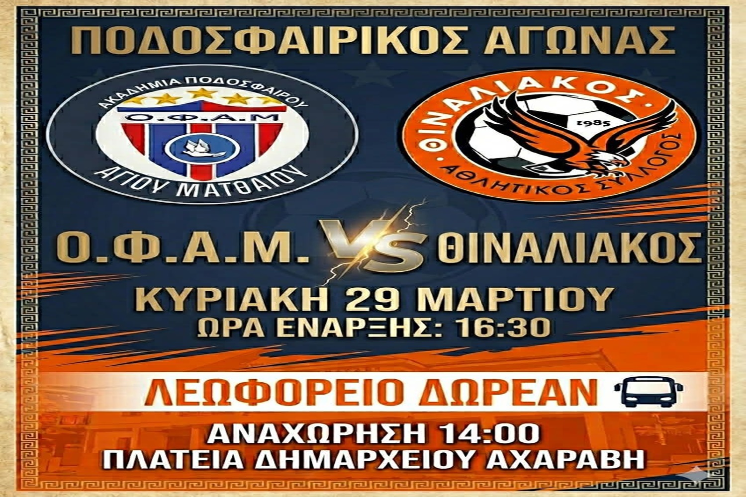 Το Σωματείο μας θα διαθέσει την Κυριακή 29 Μαρτίου λεωφορείο για την ΔΩΡΕΑΝ μετακίνηση των μικρών και μεγάλων φιλάθλων μας, ώστε να στηρίξουμε όλοι μαζί την ομάδα σε αυτή τη σημαντική αναμέτρηση!