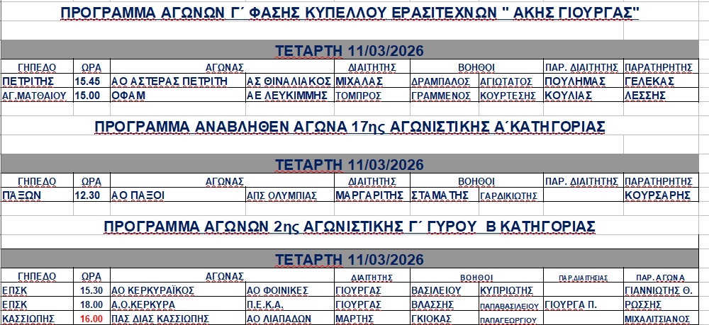 Η ΕΠΣΚ ανακοίνωσε τους διαιτητές που θα διευθύνουν τα ματς της Τετάρτης σε Κύπελλο, Α και Β ΕΠΣΚ. <img class="alignnone wp-image-62050 size-full" src="https://www.corfusports.com/wp-content/uploads/2026/03/cats-8.jpg" alt="" width="1000" height="459" />