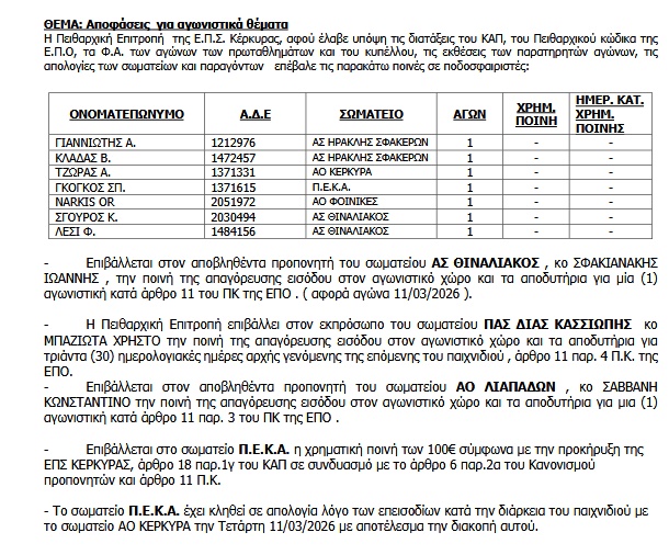 Θιναλιακός, ΠΕΚΑ αλλά Λιαπάδες βρισκονται στις επιβολές ποινών πλην εκείνων που αφορούν ποδοσφαιριστές. <img class="alignnone wp-image-62108 size-full" src="https://www.corfusports.com/wp-content/uploads/2026/03/cats-11.jpg" alt="" width="610" height="506" />