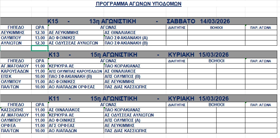 Η ΕΠΣΚ ανακοίνωσε τους αγώνες του Σαββατοκύριακου στα πρωταθλήματα υποδομών. <img class="alignnone wp-image-62061 size-full" src="https://www.corfusports.com/wp-content/uploads/2026/03/cats-10.jpg" alt="" width="913" height="450" />