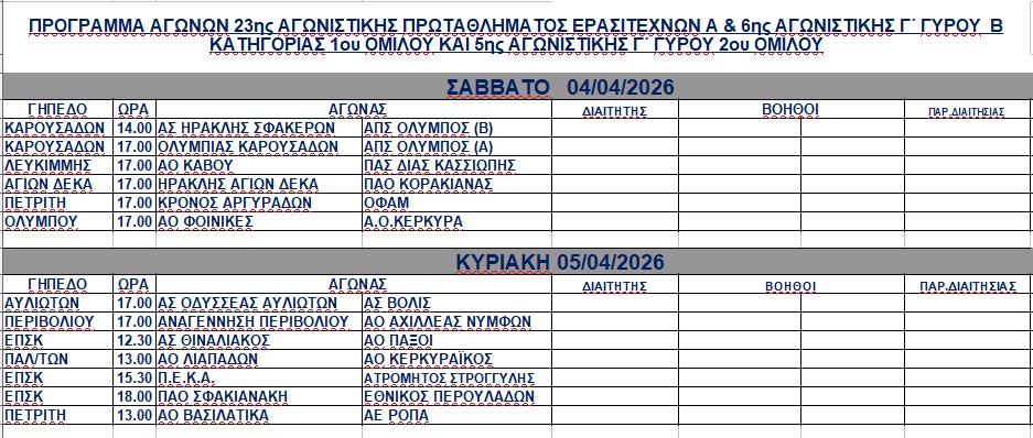 Η ΕΠΣΚ ανακοίνωσε το πρόγραμμα των αγώνων του Σ/Κ στα τοπικά πρωταθλήματα. <img class="alignnone wp-image-62438 size-full" src="https://www.corfusports.com/wp-content/uploads/2026/04/cats-1.jpg" alt="" width="937" height="398" />
